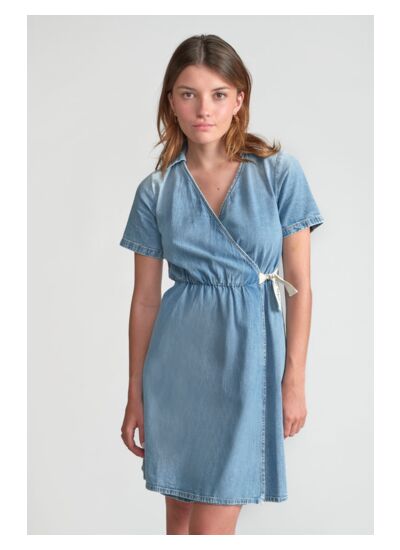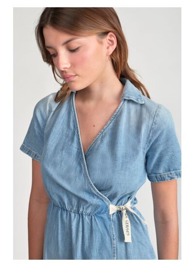Col V, manches courtes, longueur genoux, coupe portefeuille. Tissu en jeans uni, style city. Marque : Le temps des cerises.