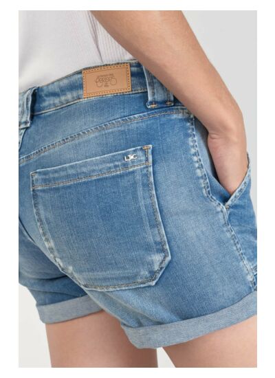 Toile stretch, coupe short, hauteur de taille standard, fermeture zippée, tissu jeans, motif uni. Marque : Le temps des cerises.