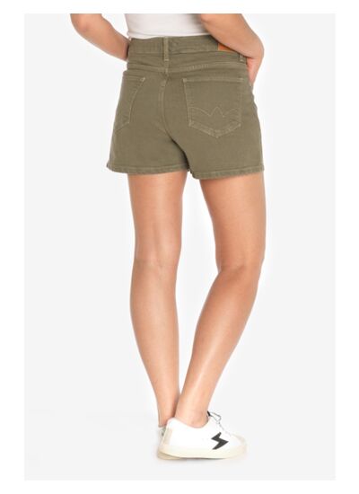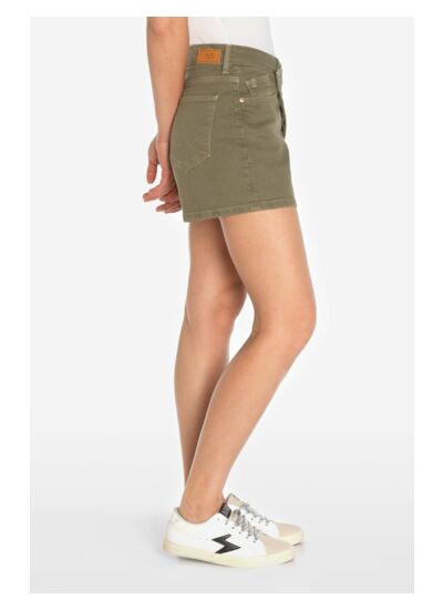 Toile stretch en jeans kaki clair. Coupe short avec taille standard. Fermeture boutonnée asymétrique. Motif uni avec abrasions et trous réparés. Marque Le temps des cerises.