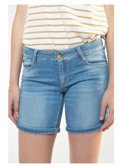 Toile stretch en jeans bleu délavé, coupe short, hauteur de taille standard, fermeture zippée, motif uni, application métallique dorée sur la poche arrière. Marque : Le temps des cerises.