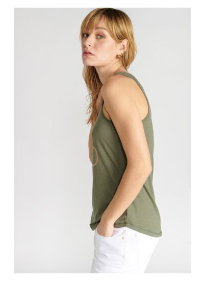 Adoptez une allure décontractée et féminine avec le débardeur Debtrame kaki, un essentiel polyvalent pour votre garde-robe. Sa simplicité élégante et son logo irisé apportent une touche subtile de modernité à vos tenues quotidiennes.