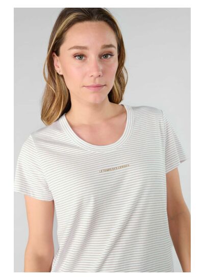 Col rond classique, manches courtes, coupe droite. Tissu doux et agréable. Motif rayures. Marque Le temps des cerises.