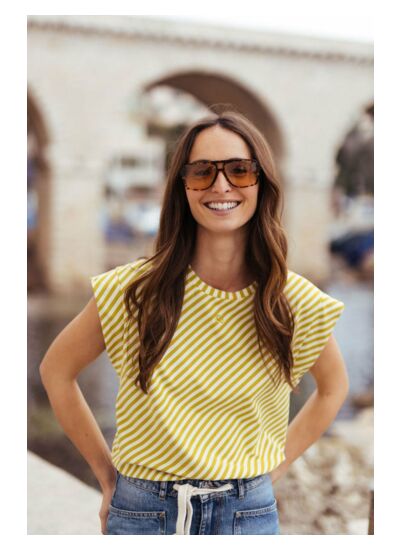 Col rond classique, coupe boyfriend ample, tissu confortable et motif rayé iconique. Marque : Le temps des cerises.