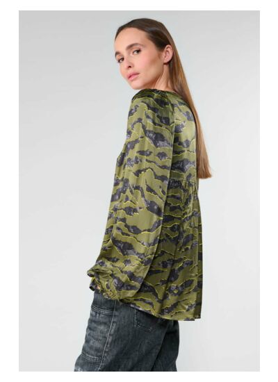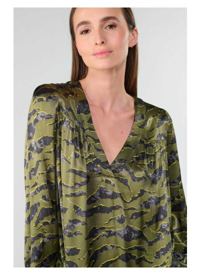 Le Top CHIMAc présente un col en V, une coupe droite, des manches longues avec poignets boutonnés, et est réalisé dans un tissu fluide à motif animalier. Marque : Le temps des cerises.