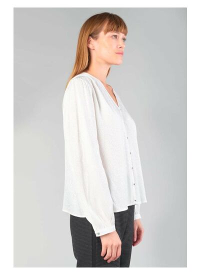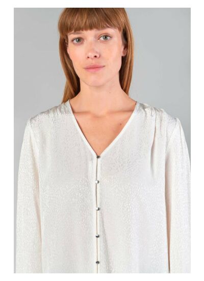Col en V, coupe droite, fermeture boutonnée, manches longues avec poignets boutonnés. Tissu fluide à motif jacquard. Marque : Le temps des cerises.