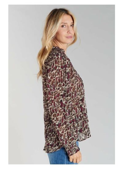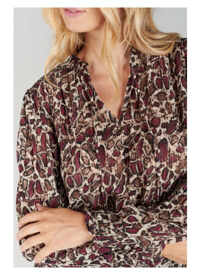 Le top JANEK est fabriqué en tissu plissé, doté d’un col en V, d’une coupe droite, de manches longues avec poignets élastiqués, et se ferme par un cordon. Son motif animalier apporte une note tendance et affirmée.