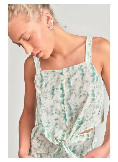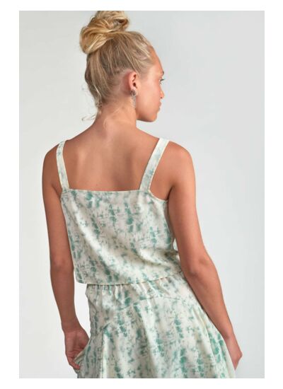 Le Top JOANIGI présente un col carré, une coupe droite et une fermeture boutonnée. Il est réalisé dans un tissu léger orné d’un motif tie and dye. Ce produit fait partie de la gamme Eco Friendly de la marque Le temps des cerises.