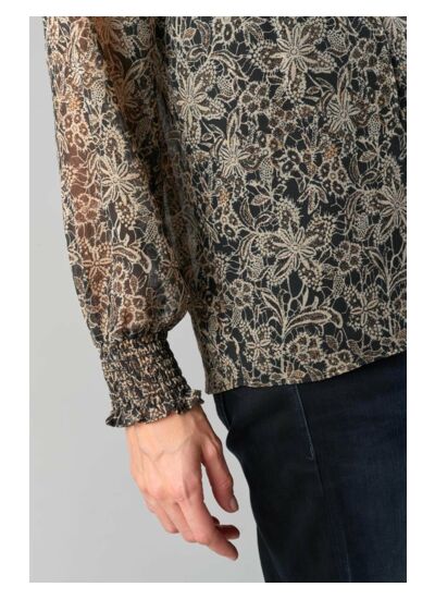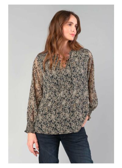 Col V, coupe droite, fermeture par cordon, manches longues avec poignets élastiqués. Tissu fluide à motif floral. Ce produit appartient à la gamme Eco Friendly de la marque Le temps des cerises.