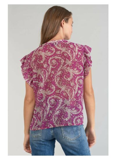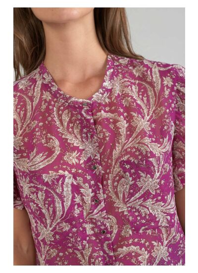 Le Top SURI présente une coupe droite, un col rond, une fermeture boutonnée et un tissu léger orné d’un motif cachemire. Ce modèle fait partie de la gamme Eco Friendly de la marque Le temps des cerises, garantissant une fabrication respectueuse de l’environnement.