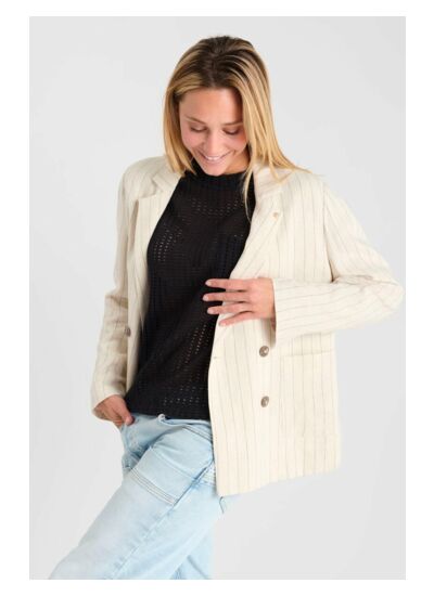 Affirmez votre style avec la veste MERIDA, un blazer à rayures qui allie élégance et modernité. Sa coupe droite et son col tailleur apportent une silhouette structurée, parfaite pour toutes les occasions.