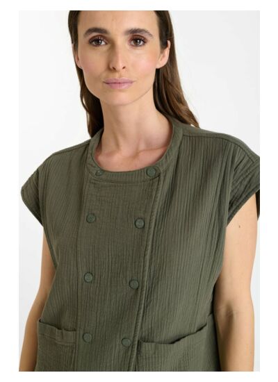 Profitez d’un vêtement facile à porter qui valorise votre confort sans sacrifier le style. La coupe ample assure une aisance parfaite, tandis que la fermeture boutonnée permet un ajustement personnalisé selon vos envies.