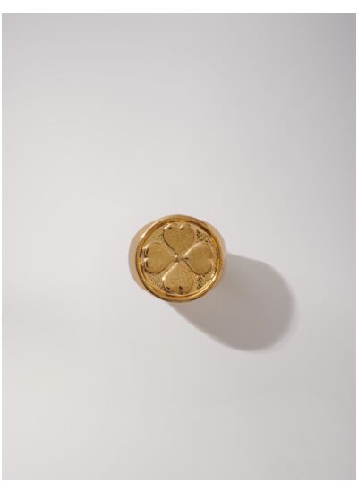 Cette bague chevalière en laiton recyclé doré arbore un trèfle à quatre feuilles délicatement formé par des cœurs. Symbole de chance et de bonheur, portez-la au doigt de votre choix : classique à l'annulaire, plus rock à l'index.