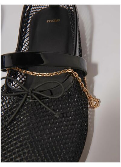 Les incontournables ballerines se réinventent cette saison en version filet mesh. Munies d'un nœud et d'une bride vernie et élastiquée, elles révèlent une chaînette dorée à charm et d'une puce Clover au dos pour ponctuer tous vos looks, des plus casual aux plus habillés.