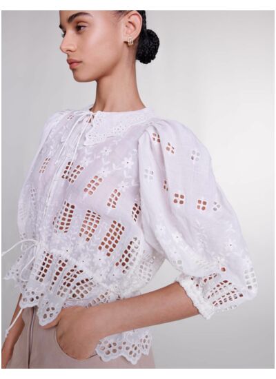 Jeu de volumes et de transparence pour cette blouse délicatement brodée et ajourée. Munie de manches 3/4 à poignets resserrés et d'une fermeture boutonnée, elle séduit par ses motifs floraux, son col claudine et son bas festonné. Empreinte d'élégance et de légèreté, ajustez son col et créez une basque en nouant sa taille.