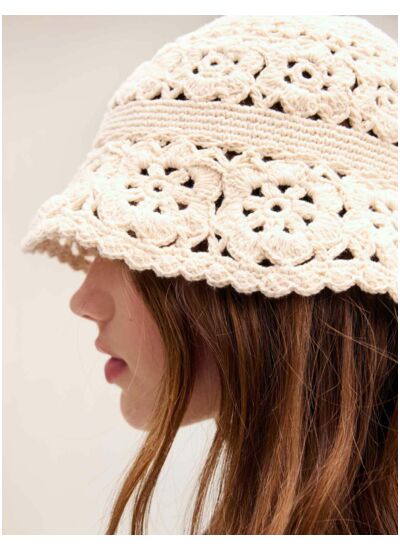 Accessoire coup de cœur du studio, ce bob en crochet se pare de fleurs ajourées. Idéal pour les beaux jours, il complètera avec élégance les tenues les plus légères.