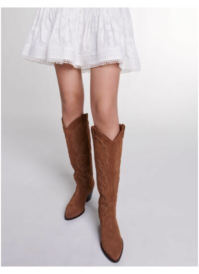 Les bottes santiags en cuir suédé Maje conviennent-elles pour un usage quotidien ? Ces bottes allient style et robustesse, idéales pour un port régulier. Leur cuir suédé offre confort et résistance, parfait pour accompagner vos tenues urbaines tout au long de la journée. Comment entretenir le cuir suédé de ces bottes ? Pour préserver leur aspect, utilisez une brosse spéciale suédé pour éliminer poussière et saletés. Appliquez un imperméabilisant adapté pour protéger contre l’humidité sans altérer la texture du cuir. Sont-elles fidèles à la taille habituelle ? La coupe de ces bottes est conforme aux standards Maje, il est conseillé de prendre votre pointure habituelle pour un ajustement optimal. Quelle tenue associer avec ces bottes santiags ? Leur design intemporel s’accorde parfaitement avec un jean slim ou une robe fluide, apportant une touche de caractère à vos looks casual ou plus sophistiqués. Ces bottes conviennent-elles pour toutes les saisons ? Leur cuir suédé est idéal pour les saisons intermédiaires, offrant chaleur et respirabilité. En hiver, privilégiez un traitement imperméabilisant pour une meilleure protection.
