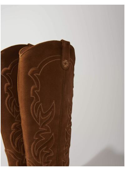 Véritables incontournables du vestiaire, ces santiags en cuir suédé arborent des motifs surpiqués sur toute la tige. Dotées d'un talon, d'un renfort souple et de bouts pointus, ces bottes esprit western dessinent une silhouette élancée pour une allure assumée.