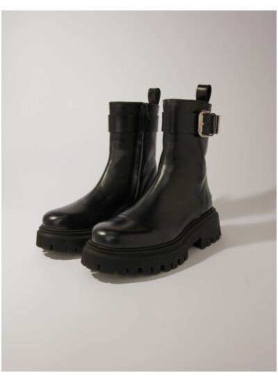 Rehaussez votre silhouette d'un pas affirmé avec ces bottines chelsea en cuir lisse surmontées d'une semelle chunky. Dotées d'une fermeture zippée intérieure, une large boucle dorée signée Maje s'invite sur le haut, pour une touche d'élégance audacieuse.