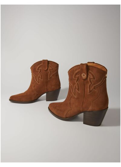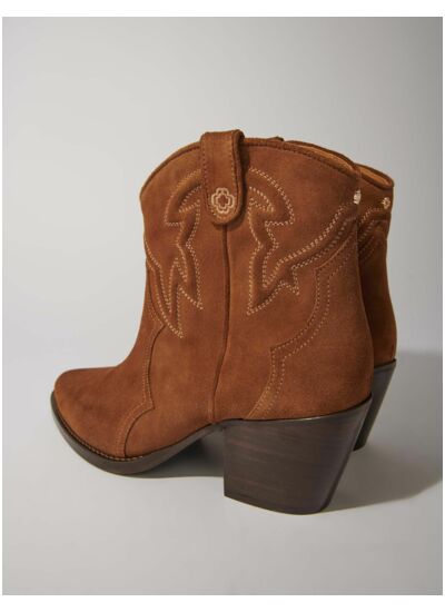 Confectionnées en cuir suédé, ces bottines santiags esprit western joue des découpes et des motifs surpiqués pour une allure assumée. Lanières latérales, talon et bouts pointus viennent souligner la silhouette avec une touche de caractère.