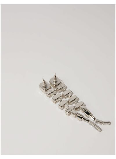 Ces boucles d'oreilles pendantes en laiton recyclé argenté révèlent une accumulation de strass, scintillant à chaque mouvement. À porter de jour comme de nuit, elles apportent une touche de lumière et de légèreté à l'allure.