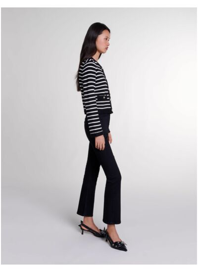 Avec quelles pièces associer ce cardigan rayé ? Ce cardigan se marie parfaitement avec un jean slim ou une jupe droite. Il complète aussi bien un look décontracté qu’une tenue professionnelle, apportant une note graphique et raffinée.