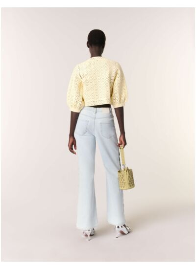 Orné de strass argentés, ce cardigan en maille crochet crée un jeu de lumière et de transparence. Une fermeture boutonnée et des manches ballons accentuent sa coupe courte et élégante.