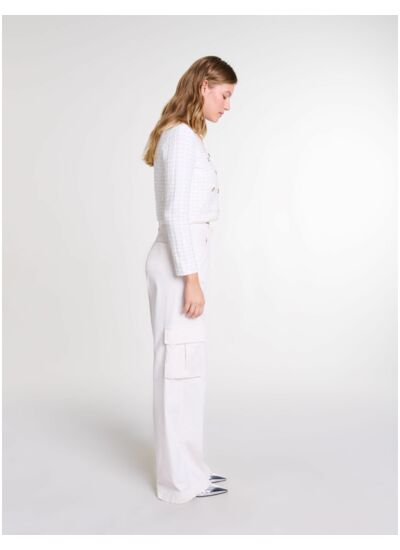 Un jeu subtil de matières et de lumière réhausse ce cardigan court en maille bloquée, paré de sequins transparents. Doté d'un col rond et de manches longues, il dévoile une fermeture et quatre poches plaquées ornées de boutons dorés.