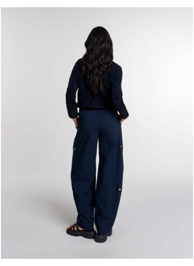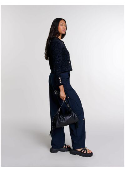 Confectionnée en jacquard velours, cette veste courte arbore fièrement les motifs emblématiques Maje M et Clover. Munie d'un col rond et de manches longues, des boutons pressions Clover soulignent avec élégance les poignets, la fermeture et les deux poches avant.