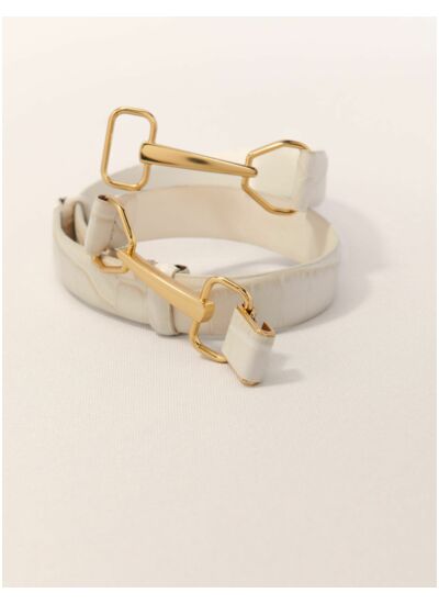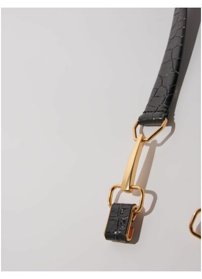Confectionnée en cuir effet croco, cette ceinture s'attache à l'avant, dévoilant des mors dorés reliés par un crochet pour une silhouette sophistiquée. Ajustable et coulissante au dos, elle se glisse aisément dans les passants d'un jean ou sur une robe vaporeuse.