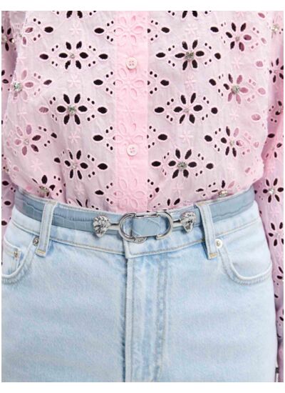 Comment se distingue le design de cette ceinture Maje ? Elle se caractérise par une finesse raffinée et un mors lion en métal, apportant une touche audacieuse et sophistiquée à vos tenues.