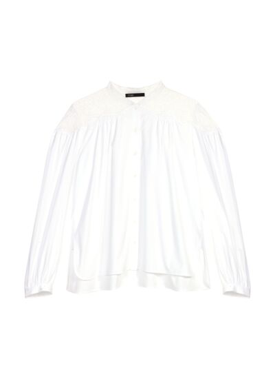 La chemise en popeline se réinvente cette saison avec audace. Son jeu de transparence, souligné par des épaules en dentelle, dessine une silhouette élégante et délicate. Munie d'un col rond et de manches longues, elle affiche une fermeture et des poignets boutonnés.