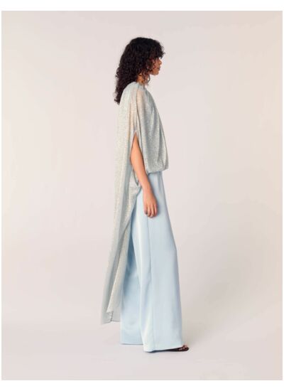 Cette combinaison 2-en-1 associe un top plissé, orné de motifs fleuris et de lurex doré, à un pantalon uni au tombé fluide. Une cape longue et une ceinture à maillons dorés créent un jeu de volumes des plus flatteurs.