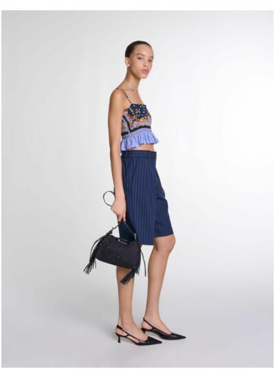 Pour un look chic et casual, elle s'associe à un short bermuda de costume, des bijoux et des escarpins.