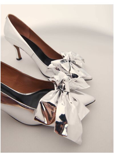Les intemporels escarpins en cuir se réinventent avec style. Cuir métallisé effet miroir et large nœud à l'avant : une esthétique ultra féminine pour une allure à la fois élégante et affirmée.