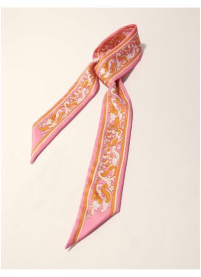 Comment porter ce foulard pour sublimer une tenue ? Son format ruban permet de l’utiliser de multiples façons : noué autour du cou pour une touche chic, en headband pour un look bohème, ou attaché à un sac pour personnaliser votre style avec élégance.