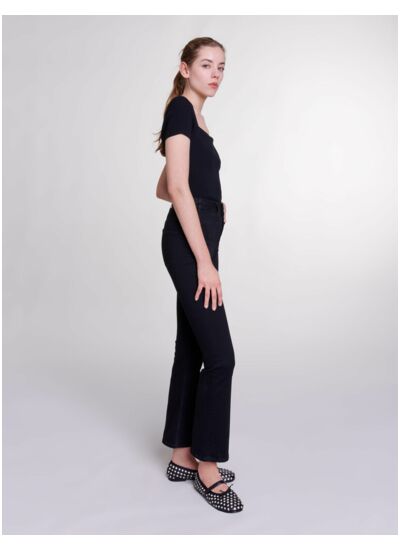 Ce jean Maje est-il adapté pour un look formel ou décontracté ? Sa coupe évasée et sa finition soignée permettent de le porter aussi bien en tenue casual qu’avec une blouse ou un blazer pour un style plus habillé.