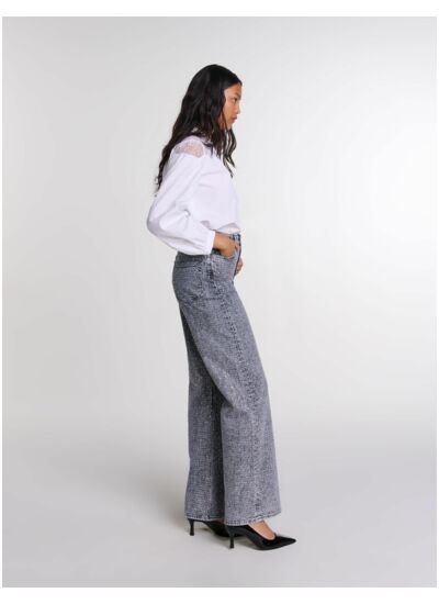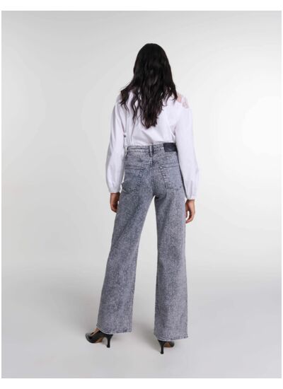 L'intemporel jean en denim délavé se twiste d'une touche d'éclat irrésistible, paré de strass en all-over. Muni de cinq poches, sa coupe large flatte les silhouettes et structure l'allure pour un look à la fois chic et casual.