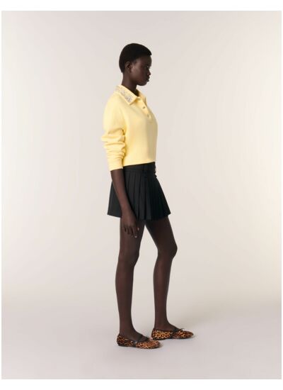 Cette saison, la jupe courte plissée se réinvente, alliant élégance et confort. Une ceinture amovible, ornée d’un bouton travaillé, souligne la taille cintrée et assure un tombé évasé.