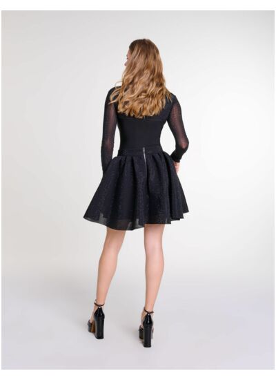 Entièrement doublée, cette jupe courte dévoile un jeu de volumes, souligné par des plis délicats. Ornée de strass en all-over, elle dessine une silhouette irrésistible, idéale pour illuminer vos soirées.