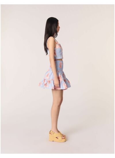 Avec un imprimé fleuri aux couleurs pastel, cette jupe courte en taffetas dévoile une silhouette légère et évasée. Smockée à la taille, elle se pare de volants délicats pour un effet de mouvement.