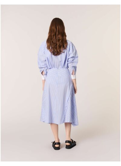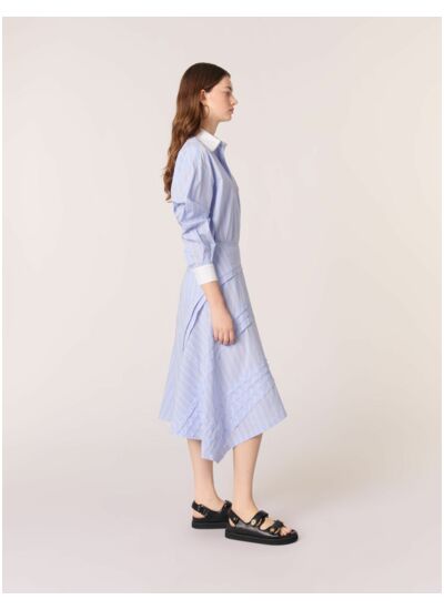 Légère et élégante, cette jupe longue reprend les codes de la chemise avec son imprimé rayures et son effet déstructuré. Elle se distingue par un tombé asymétrique délicatement évasé, rehaussé de petits volants.