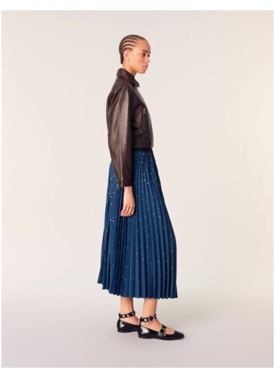 Cette jupe longue et plissée se pare de studs en all-over, illuminant chacun de vos mouvements. Une ceinture élastiquée contrastée souligne la taille, tandis son bas évasé confère une allure fluide.