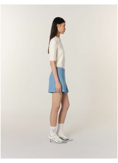 Confectionnée dans un tweed à sequins scintillants, cette jupe-short courte présente une taille marquée d'une ceinture à boucle gravée Maje. Un pan lisse à l'avant et plissé sur le côté, apporte du volume et du mouvement à l'allure. Doublée pour plus de confort, elle se porte aussi bien en journée qu'en soirée.