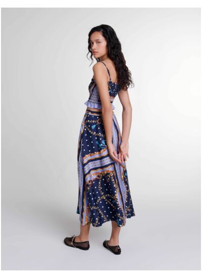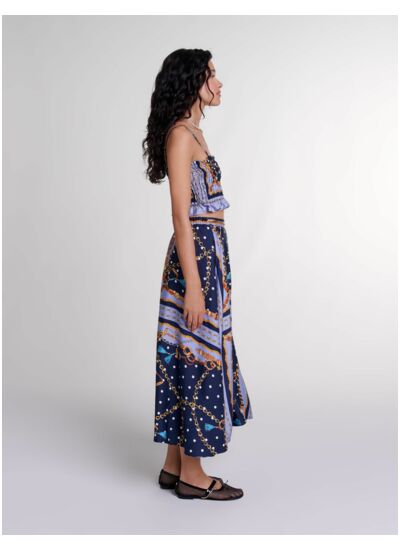 C'est l'un des imprimés phares de la saison : inspiré du foulard, il dévoile des motifs chaînes, et s'invite sur cette jupe short satinée. Légère et évasée, elle est ornée de maillons gourmettes en métal doré à la taille et dessine une silhouette fluide et pleine d'allure.