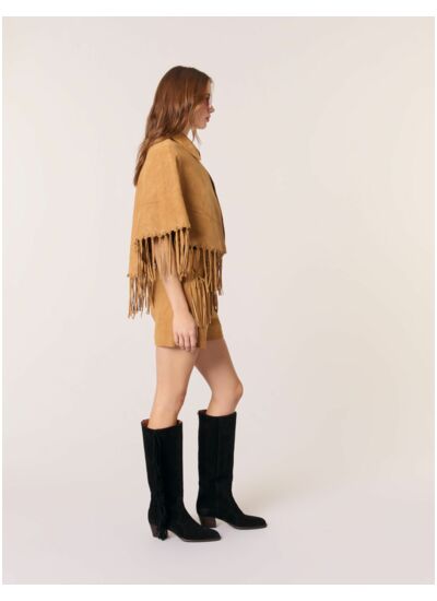 Confectionné en cuir suédé, ce manteau court reprend les codes du Western. Son effet cape est souligné de bords à franges et d'œillets argentés, tandis qu'un col chemise à crochet permet un porté aussi bien ouvert que fermé.