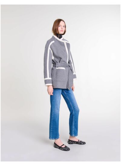 Confectionné à partir de laine mélangée, ce manteau court double-face offre un jeu de contrastes et de volumes, avec des lignes affirmées. Muni d'un col croisé légèrement montant et de manches longues, il dévoile un bouton et deux poches plaquées à l'avant. Ses liserés noirs et sa ceinture à nouer à la taille apportent de la structure et une touche d'audace, conférant une silhouette parfaitement ajustée.
