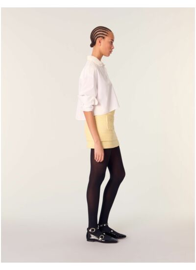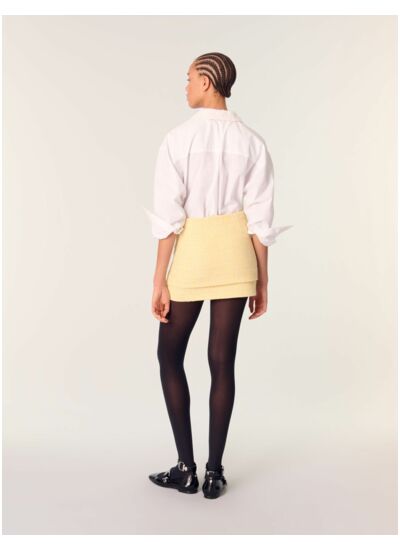 Confectionnée en tweed jaune et scintillant, cette jupe courte dévoile un bord effet doublé qui souligne sa coupe élégante. Deux poches plaquées, ornées de boutons, apportent une touche structurée. Optez pour un total look avec la veste coordonnée, ou adoptez un top plus casual pour créer un jeu de contraste.