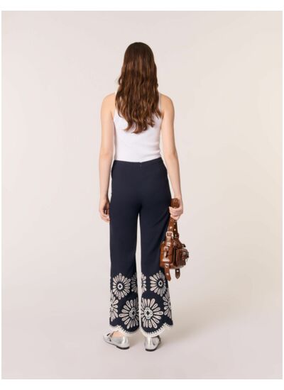 Élégance et légèreté pour ce pantalon brodé de fleurs contrastées en crochet. Délicatement festonné sur le bas, il sublime la silhouette et offre beaucoup d'allure.