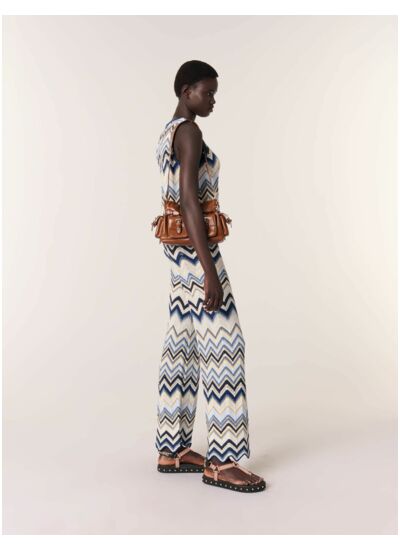 Ce pantalon en maille crochet dévoile un jeu de motifs en chevrons délicatement scintillants. Sa taille élastiquée et son bas évasé, délicatement festonné, créent une silhouette élancée.