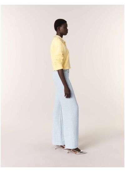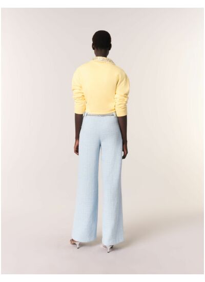 Pièce incontournable du vestiaire Maje, ce pantalon en tweed s'illumine d'une nuance bleu clair. Une ceinture chaîne argentée, ornée de maillons et de pampilles Clover, marque la taille haute avec éclat.